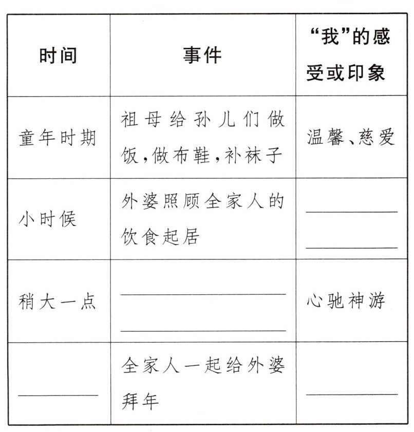 6. 文章按照时间顺序记叙了“我”与祖母、外婆之间的几件事,让人读后倍感温馨。请你阅读全文,结合文章内容补全下面的表格。(4 分)