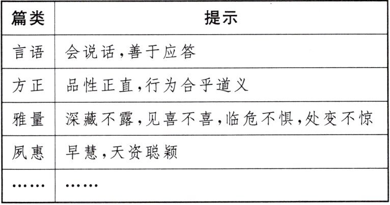 (2)不一会儿谢玄从淮水战场上送出的信到了,谢安看完信,默不作声。 10.【甲】文主要通过人物对话的形式,记叙了谢道韫与胡儿用两个生动有趣的比喻来形容雪的故事,体现出他们会说话、善于应答的特点,所以应该归类于言语篇。 雅量 【乙】文描写了谢安得知淝水之战大获全胜后神色自若,深藏不露,见喜不喜,所以应该归类于雅量篇。