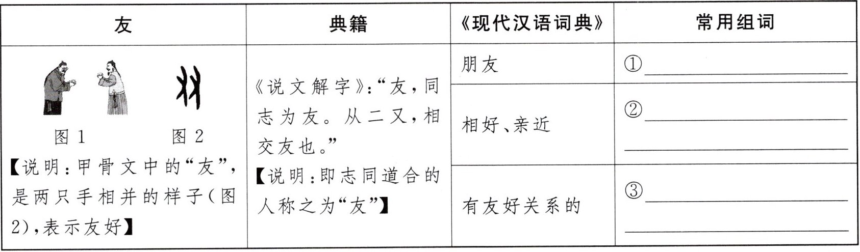 1.【汉字溯源】汉字中,有很多字可以根据字形来猜测它的意义。请你根据下面关于"友"字的资料卡,完成表格。