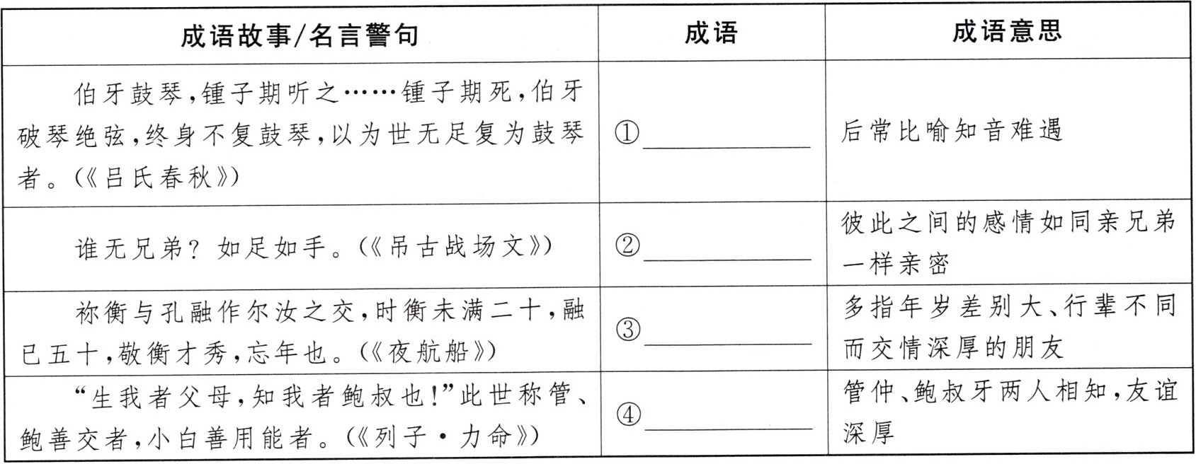 2.【成语故事】为了探究交友的内涵,小鹏收集了中国古代与交友有关的成语故事(名言警句)。请根据成语故事(名言警句)和成语意思,写出相对应的成语。