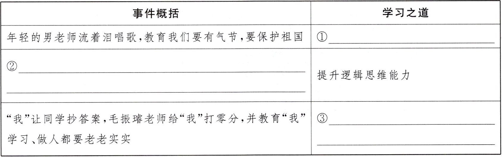 ②那是 1937 年,日本侵略的战火烧到我家乡,小学被迫停办。最后一课是唱歌课,年轻的男老师曲调低沉、缓慢,唱着唱着就流下了眼泪。我们这些不满十岁的孩子也感动得哭起来。老师最后说:“记住,要有气节,要把日本人打出去。”我们从未听到过这么多的大字眼,但老师那颗赤诚的心,那首乐曲的旋律,那份矢志不渝的民族气节和傲骨,深深埋进了我们幼小的心田。热爱祖国是人世间最深层最持久的情感,是立身之本,成才之基,要厚植学生心中。