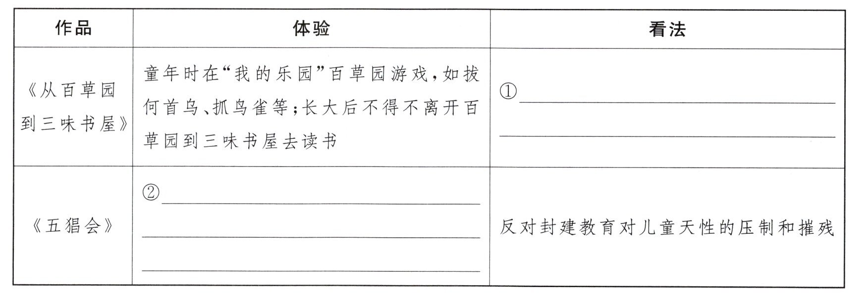 2. 对儿童教育问题的看法。现代著名诗人柳亚子曾说:“近世对于儿童教育最伟大的人物,我第一个推崇鲁迅先生。”《朝花夕拾》中有几篇作品涉及儿童教育,鲁迅于文中写了自己的体验和看法。结合文章内容,完成下表。