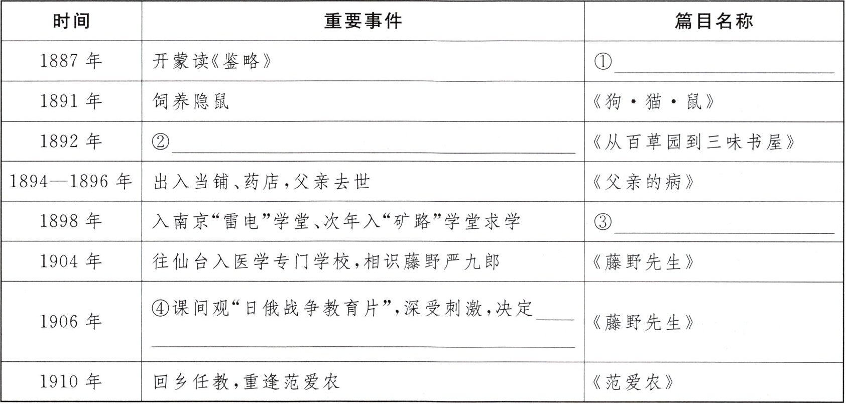 【解析】:根据题中表格所给信息,1906年对应的篇目是《藤野先生》,重要事件是课间观“日俄战争教育片”,深受刺激,决定做的事,在《藤野先生》这篇文章里,鲁迅看到“日俄战争教育片”后决定弃医从文。对于表格中的①,1887年开蒙读《鉴略》对应的篇目是《五猖会》 ;②1892年对应的事件,结合《从百草园到三味书屋》的内容,可知是“问‘怪哉’虫”或者“后园寻乐趣(折梅/寻蝉蜕/喂蚂蚁/听故事等)” ;③1898年入南京“雷电”学堂、次年入“矿路”学堂求学对应的篇目是《琐记》。