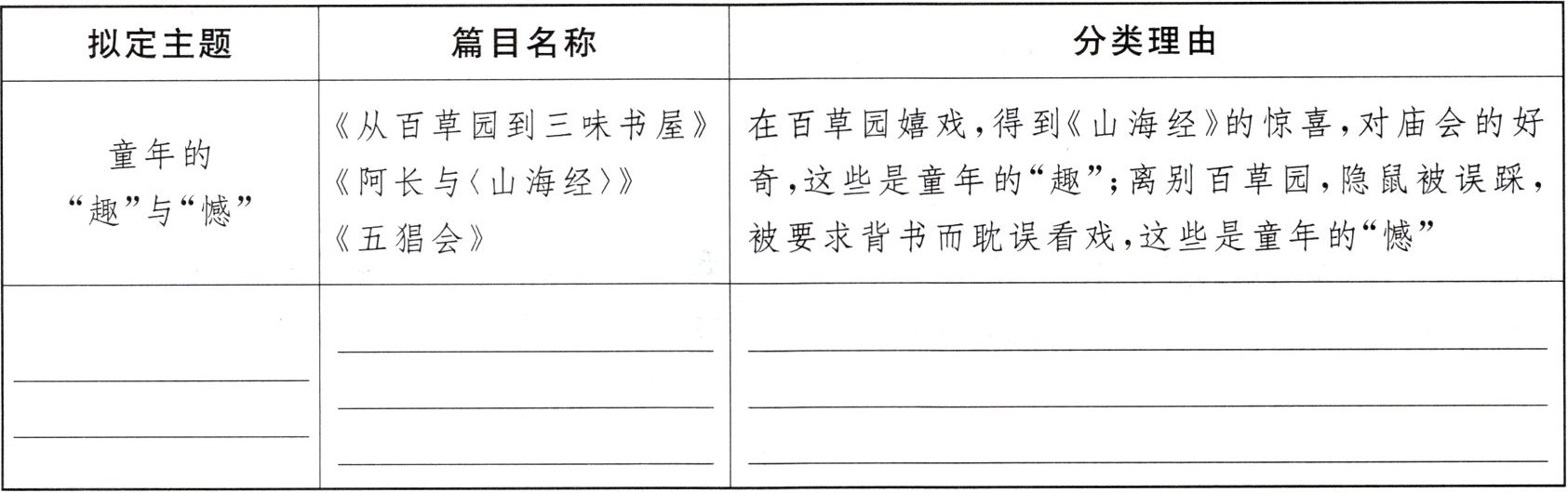 6.文学社将开展“《朝花夕拾》主题阅读”分享会,请你按照示例,重新拟定一个主题,选出相应篇目(不少于三个),并阐述分类理由。