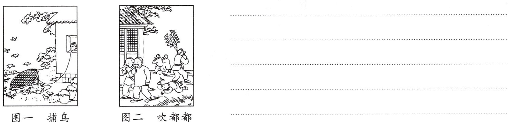 7.下面是丰子恺先生为《朝花夕拾》画的两幅插图。有人说,《朝花夕拾》包含了作者“温馨的回忆与理性的批判”。根据与图片相关的文章,任写一处能够表现作者“温馨的回忆”或“理性的批判”的内容。