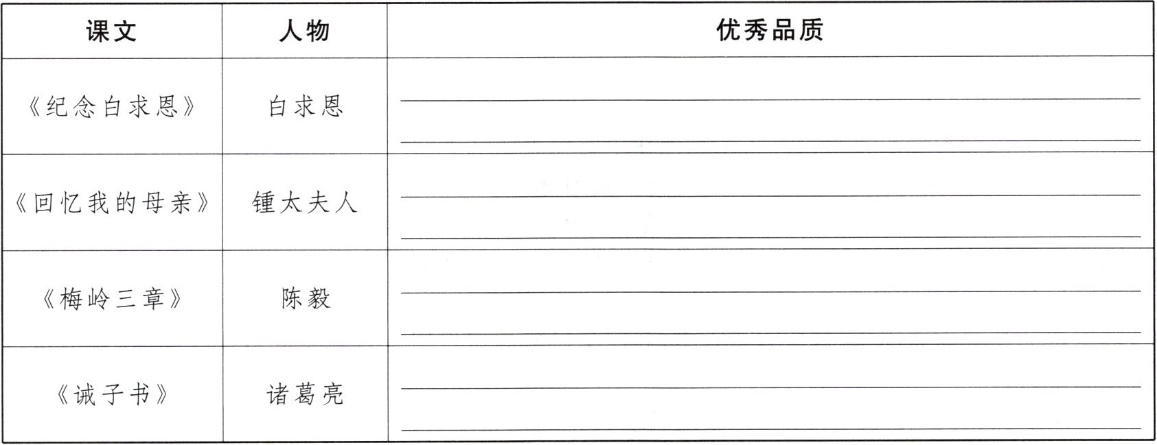 1. 请先回顾课文,梳理白求恩、锺太夫人、陈毅、诸葛亮的优秀品质,完成表格填写。