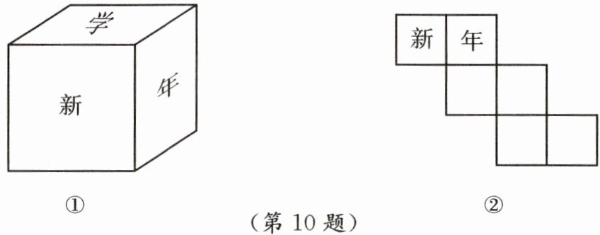 10. 一个正方体的盒子表面写有“新年学习进步”的祝福语(图②),其中“新”与“习”相对,“年”与“进”相对.请在图②的平面展开图中填上其他四个字.