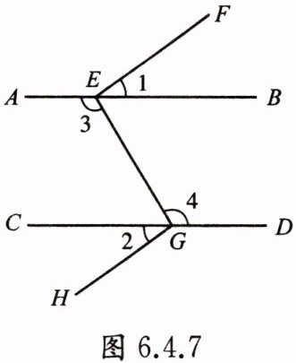 例2 如图6.4.7,已知∠1= ∠2,∠3= ∠4,EF与GH平行吗?为什么?