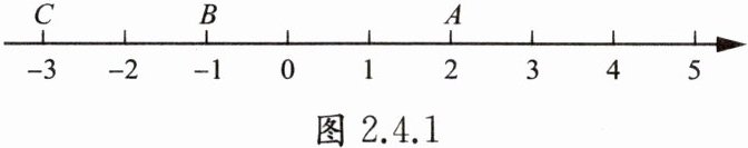 例3 数轴上两点之间的距离可以用这两个点表示的数通过减法运算得到.例如,在如图2.4.1所示的数轴上,点$A,B间的距离为2-(-1)= 3$,点$B,C间的距离为(-1)-(-3)= 2$,点$A,C间的距离为2-(-3)= 5$.