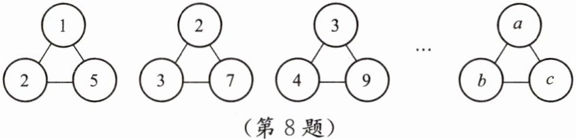 8. 如图,下列各图形中的三个数之间均具有相同的规律.根据此规律,请写一条关于$ a,b,c $三个量的等式.