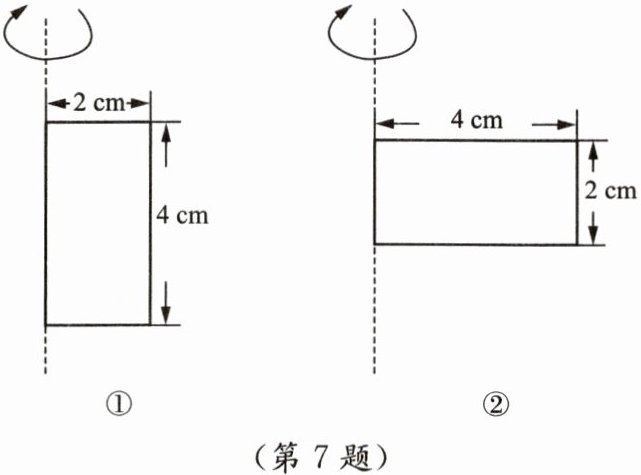 7. 如图,将长和宽分别为4 cm和2 cm的长方形卡纸分别绕长、宽所在的直线旋转一周得到两个几何体,所得两个几何体的体积相等吗? 如果不相等,哪一个几何体的体积较大?