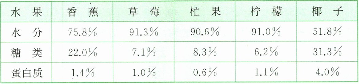 3. 几种水果中水分、糖类、蛋白质的含量占比如下表。