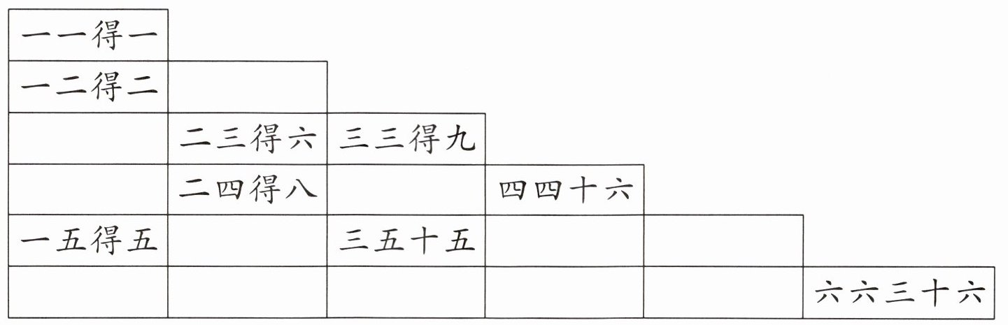 二二得四;一三得三;一四得四,三四十二;二五一十,四五二十,五五二十五;一六得六,二六十二,三六十八,四六二十四,五六三十