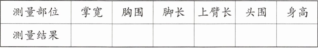 由于测量结果具有个体差异性,且题目要求量一量自己身体部位的长度,需要考生实际操作测量才能得出具体数据,因此无法直接提供标准答案。请考生使用尺子(如厘米尺)对自身掌宽、胸围、脚长、上臂长、头围、身高进行测量,并将测量得到的厘米数分别填入对应的表格空格中。