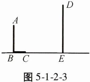 5. 如图5-1-2-3,已知AB和DE是直立在地面上的两根立柱,AB = 5 m,某一时刻AB在阳光下的投影BC = 3 m。
