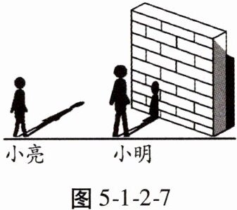 10. 如图5-1-2-7,小明和小亮在阳光下玩耍,小亮对小明说:“我的身高为1.6 m,你的身高我不知道,但我量出此时你、我的影长,我就能求出你的身高。”小明不服气,当他们走到了一堵墙前时,小明的影子没有全部落在地面上,有一部分落在墙上,小明灵机一动,问小亮:“现在你能求出我的身高吗?”小亮说:“那还不容易,我的影长(全在地面上)为2.4 m,你的影长 = 墙上的影长 + 地上的影长 = 0.6 + 1.8 = 2.4 (m),那么你的身高就是(1.6×2.4)/2.4 = 1.6 (m)。”小明哈哈大笑:“照你这么说,我与你一样高啦。”小明在小亮耳边说了几句话,小亮就恍然大悟。你知道小亮错在哪吗?