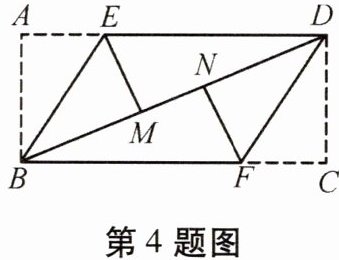 4. 准备一张矩形纸片 $ABCD$,按如图所示操作:将 $\triangle ABE$ 沿 $BE$ 翻折,使点 $A$ 落在对角线 $BD$ 上的点 $M$ 处,将 $\triangle CDF$ 沿 $DF$ 翻折,使点 $C$ 落在对角线 $BD$ 上的点 $N$ 处。