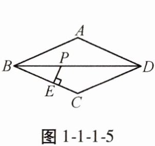 5. 如图 1-1-1-5,$P$ 是菱形 $ABCD$ 对角线 $BD$ 上的一点,$PE \perp BC$,垂足为 $E$,$PE = 4\ cm$,则点 $P$ 到直线 $AB$ 的距离为