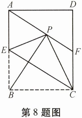 8. 如图,在矩形 $ABCD$ 中,$E$ 是 $AB$ 的中点,沿 $EC$ 对折矩形 $ABCD$,使点 $B$ 落在点 $P$ 处,折痕为 $EC$,连接 $AP$ 并延长交 $CD$ 于点 $F$,连接 $BP$。