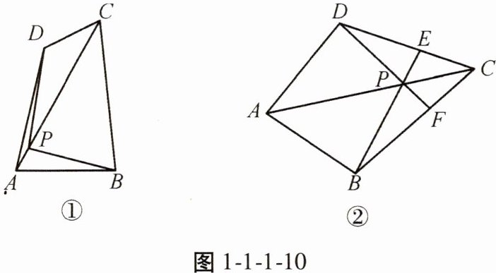 10. (新定义题) 如图 1-1-1-10①,点 $P$ 为四边形 $ABCD$ 对角线 $AC$ 所在直线上的一点,若 $PD = PB$,$PA \neq PC$,则点 $P$ 为四边形 $ABCD$ 的“准等距点”。