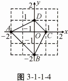 (2)小聪先从袋子中随机摸出一个小球,记下数字作为平面直角坐标系内点M的横坐标,然后放回搅匀;接着小明从袋子中随机摸出一个小球,记下数字作为点M的纵坐标。如图3-1-1-4,已知四边形ABCD的四个顶点的坐标分别为A(-2,0),B(0,-2),C(1,0),D(0,1),请用画树状图或列表的方法求点M落在四边形ABCD内部(含边界)的概率。