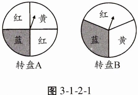【例1】小明、小芳做一个“配色”的游戏。如图3-1-2-1是两个转盘,每个转盘被分成面积相等的几个扇形,并涂上图中所标的颜色。转动两个转盘,若一个转出红色,一个转出蓝色,则红色和蓝色在一起配成紫色,小芳获胜;同样,蓝色和黄色在一起配成绿色,小明获胜;在其他情况下,小明、小芳不分胜负。