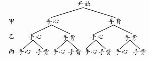 9. “手心、手背”是在同学中广为流传的游戏。游戏时,甲、乙、丙三方每次出“手心”“手背”两种手势中的一种,规定:①出现三个相同的手势不分胜负,继续比赛;②出现一个“手心”和两个“手背”或者出现一个“手背”和两个“手心”时,则出一种手势者为胜,两种相同手势者为负。