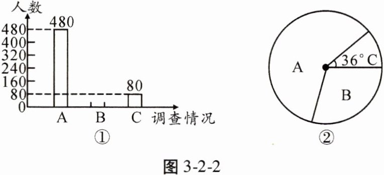 8. 为了了解初中生毕业后就读普通高中或就读中等职业技术学校的意向,某校对八、九年级部分学生进行了一次调查,调查结果有三种情况:A. 只愿意就读普通高中;B. 只愿意就读中等职业技术学校;C. 就读普通高中或中等职业技术学校都愿意。学校教务处将调查数据进行了整理,并绘制了如图 3 - 2 - 2 所示的尚不完整的统计图,请根据相关信息,解答下列问题: