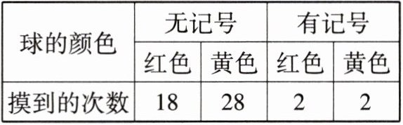 (2)由题意可知,50次摸球试验活动中,出现有记号的球4次,$\therefore$总球数为$8÷\frac{4}{50}=100$(个),$\therefore$红球数为$100×40\% =40$(个)。答:盒中有红球40个。