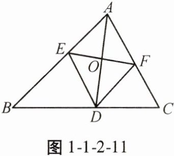 9. 如图1-1-2-11,AD是△ABC的角平分线,线段AD的垂直平分线分别交AB和AC于点E,F,连接DE,DF。