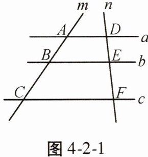 【例 1】如图 4 - 2 - 1,直线 $a$,$b$,$c$ 分别与直线 $m$,$n$ 交于点 $A$,$B$,$C$,$D$,$E$,$F$。已知直线 $a // b // c$,若 $AB = 2$,$BC = 3$,则 $\frac{DE}{EF}$ 的值为 (
