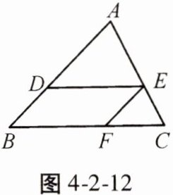 9. 如图 4 - 2 - 12,在 $\triangle ABC$ 中,$DE // BC$,$EF // AB$,$\frac{AD}{DB} = \frac{3}{2}$,$AB = 18$,$BC = 20$。