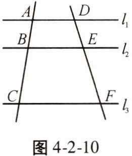 7. 如图 4 - 2 - 10,直线 $l_1 // l_2 // l_3$,直线 $AC$ 分别交 $l_1$,$l_2$,$l_3$ 于点 $A$,$B$,$C$,直线 $DF$ 分别交 $l_1$,$l_2$,$l_3$ 于点 $D$,$E$,$F$。已知 $\frac{AB}{AC} = \frac{1}{3}$,则 $\frac{EF}{DE} = $
