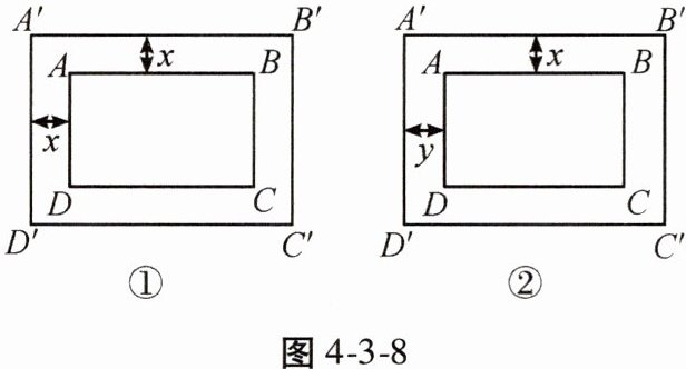 (2) 如果相对着的两条小路的宽均相等,宽度分别为 $x$,$y$,如图②所示,请问:小路的宽 $x$ 与 $y$ 的比值为多少时,矩形 $A'B'C'D'$ 和矩形 $ABCD$ 相似?请说明理由。