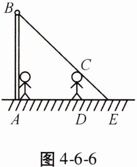 4. 如图 4 - 6 - 6,小亮从路灯下向前走了 5 m,发现自己在地面上的影长 DE 是 2 m,如果小亮的身高为 1.6 m,那么路灯离地面的高度 AB 是