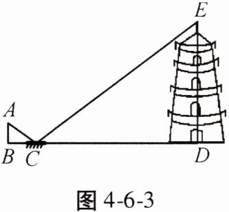 【例 3】如图 4 - 6 - 3,小颖在水平地面上放置了一小块平面镜 C(大小忽略不计)来测量宝塔 DE 的高度,已知当镜子与塔的距离 CD = 20 m,镜子与小颖的距离 BC = 2 m,小颖刚好从镜子中看到塔的顶端 E,若小颖的眼睛距离地面的高度 AB = 1.5 m,求塔 ED 的高度。