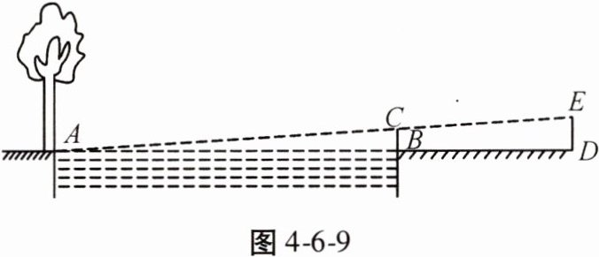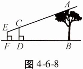 6. 如图 4 - 6 - 8,为了测量树 AB 的高度,测量者在点 D 处立一高 2 m 的标杆 CD。现测量者从 E 处可以看到标杆顶 C 与树顶 A 在同一条直线上,如果测得 BD = 20 m,FD = 4 m,EF = 1.8 m,则树的高度是