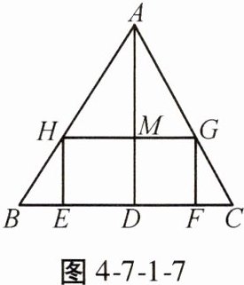 7. 如图4-7-1-7,$\triangle ABC$是一张锐角三角形的硬纸片,AD是边BC上的高,BC = 36 cm,AD = 27 cm,从这张硬纸片上剪下一个长HG是宽HE的2倍的矩形EFGH,使它的一边EF在BC上,顶点G,H分别在AC,AB上,AD与HG的交点为M。