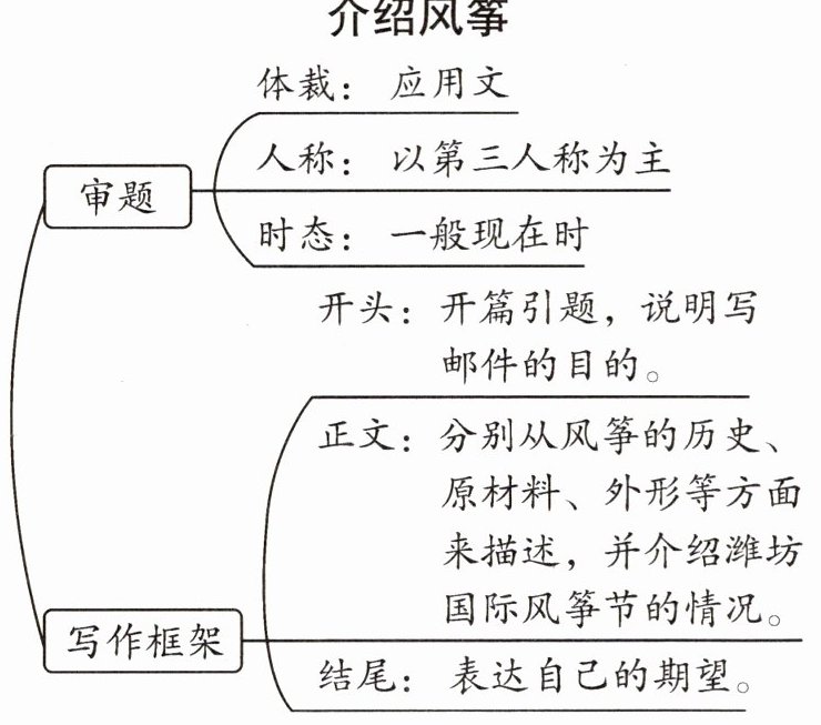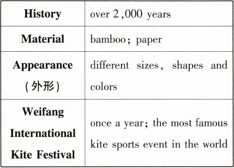 Ⅰ. 1. hear from 2. be famous for 3. be made of 4. once a year 5. take part in 6. fly kites Ⅱ. 1. In your e-mail, you said you were interested in kites in my hometown. 2. The Weifang International Kite Festival is held once a year. 3. I hope you can come to China and fly kites with me some day. Ⅲ. One possible version: Dear Jim, How is everything going? I'm glad to hear from you. In your e-mail, you said you were interested in kites in my hometown. Now let me tell you something about them. Weifang is famous for making and flying kites. The history of making kites can date back to over 2, 000 years ago. Kites are usually made of bamboo and paper. They have different sizes, shapes and colors. The Weifang International Kite Festival is held once a year. It is the most famous kite sports event in the world. A large number of Chinese and foreign kite fans come to Weifang to take part in the competition. Flying kites is exciting. I hope you can come to China and fly kites with me some day. Yours, Li Hua