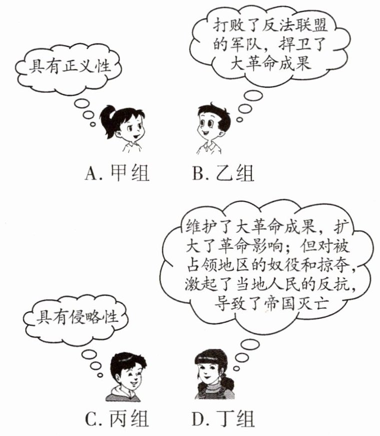 合作探究是学习历史的有效方法之一。陕西省某中学九年级(2)班同学在学习法国大革命的内容时,以线上视频云分组的形式组织了一场“评价拿破仑对外战争”的讨论会,讨论的主要观点如下图。哪一组同学的观点较全面、辩证地评价了拿破仑的对外战争?( )