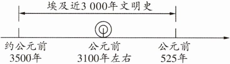 B 【解析】根据年代尺结合所学知识可知,约从公元前3500年开始,在非洲的尼罗河两岸陆续出现了若干个小国家;公元前3100年左右,初步统一的古代埃及国家建立;在法老图特摩斯三世统治时期,古代埃及成为强大的军事帝国;公元前525年,古埃及被波斯帝国吞并。所以A、C、D三项与"公元前3100年左右"不符,B项符合题意。故选B。