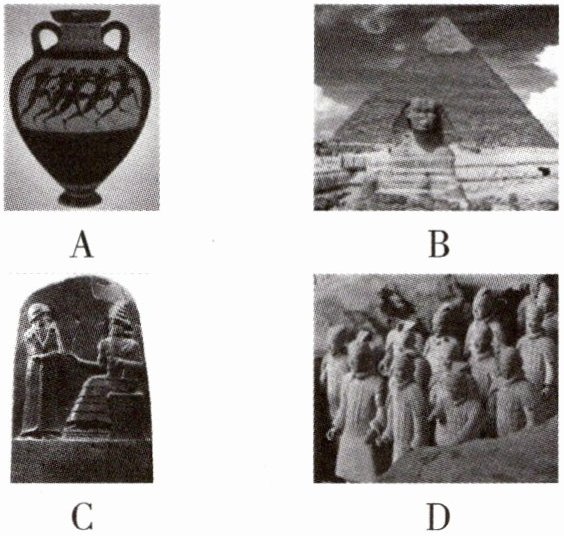 B 【解析】金字塔是古埃及文明的象征,反映了古埃及社会经济发展的较高水平,是古埃及人智慧的结晶。B项是金字塔和狮身人面像,符合题意。故选B。