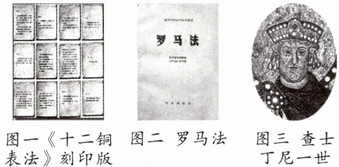 (1)图三人物:先后组织编纂《查士丁尼法典》《法学汇纂》《法理概要》《新法典》,共同构成《罗马民法大全》。图一:对罗马帝国的扩张和征服起到了推动作用,有利于罗马帝国统治的稳固和发展;图二:体现了一定的法治精神,其影响延续至今。