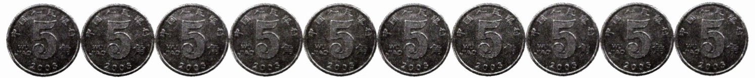 如图,用10枚5角硬币排成一排,一共长约20厘米。