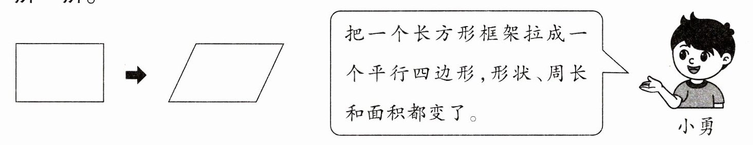 小勇说得不对,因为把一个长方形框架拉成一个平行四边形,周长不变,形状、面积变了。