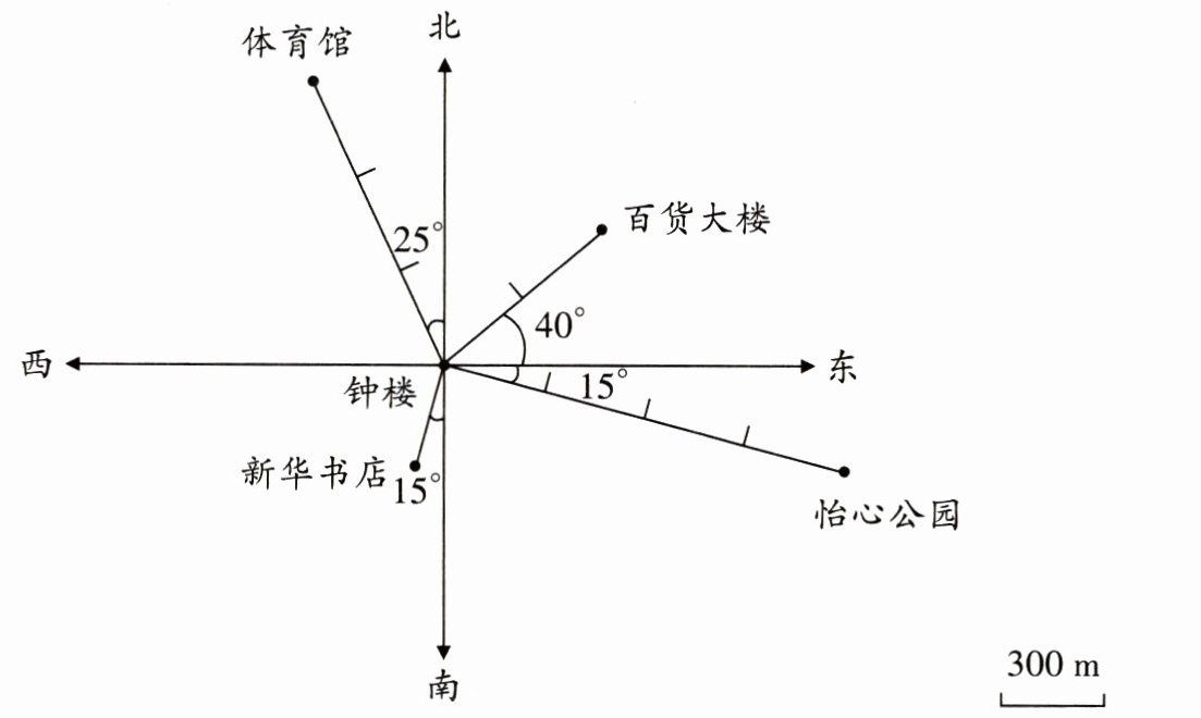 3. 画北偏西30°方向线段:从广场位置,按北偏西30°方向画2厘米线段,标出公司位置。