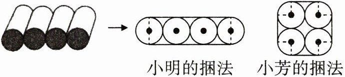 四、学校开展“卫生纸芯变废为宝”活动。小明和小芳都想到了用纸芯做笔筒。他们分别把4个纸芯摆好后用彩绳捆绑固定。两位同学的捆绑方式如下图所示(打结处不计),若纸芯的直径约为3 cm(纸芯厚度忽略不计),那么这两种捆法所用彩绳的长度相等吗?请说明理由。