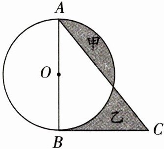 四、如图,在直角三角形 ABC 中,AB 是圆的直径,且 AB 长 4 cm。已知阴影甲的面积比阴影乙的面积少$ 0.8 cm^2,$求 BC 的长。