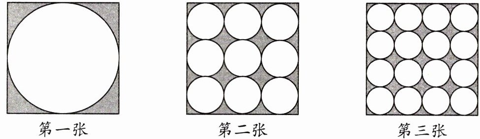 3. 从三张同样大的正方形铁皮中,分别按下面的三种方式剪出不同规格的圆片。剪完圆片后,哪张铁皮剩下的废料多?(