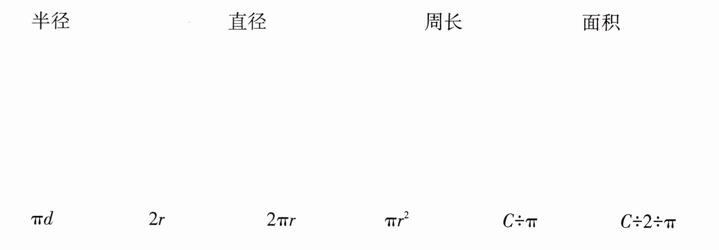 【答案】:半径——$2r$,$C÷2÷π$;直径——$2r$,$C÷π$;周长——$πd$,$2πr$;面积——$πr²$